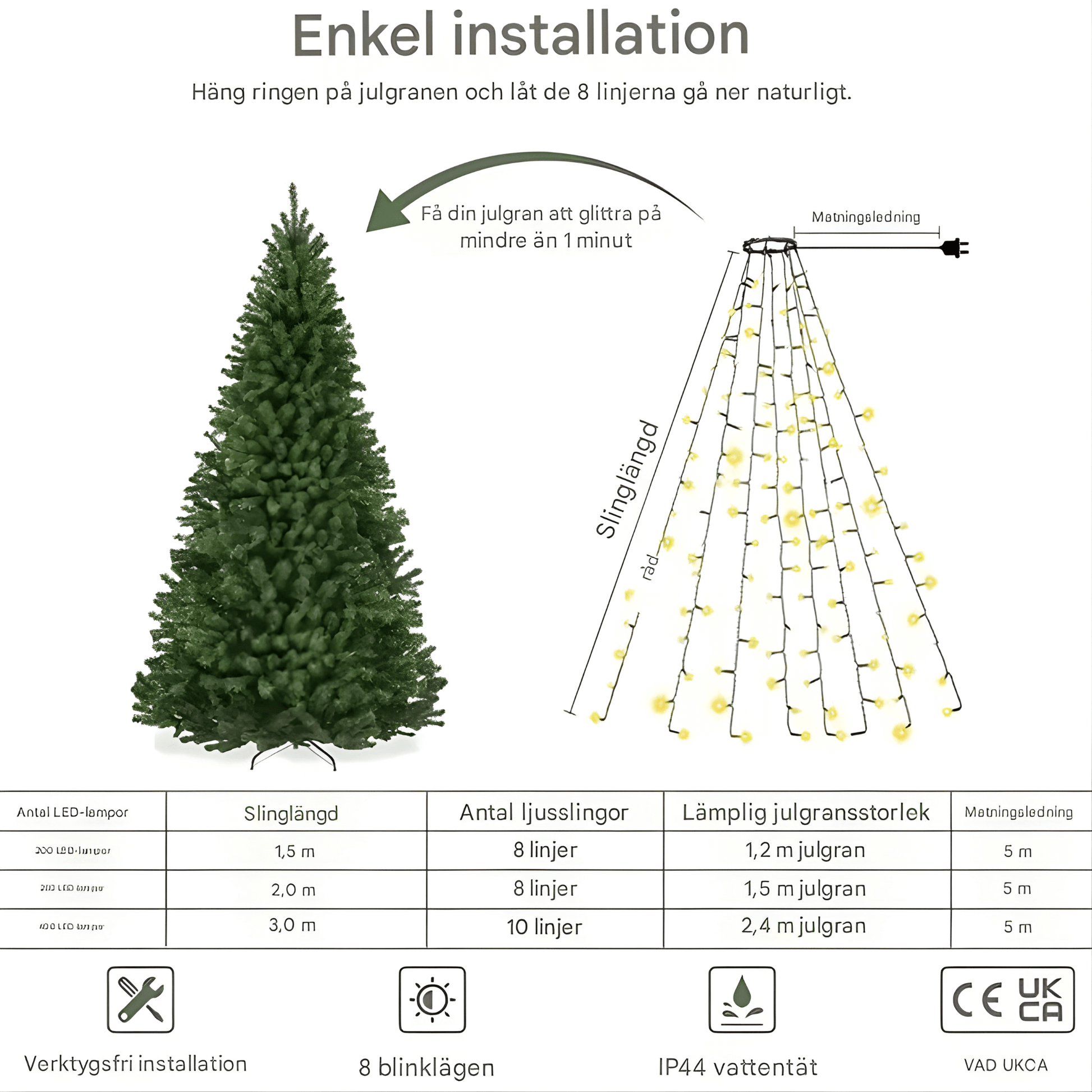Placez l’anneau lumineux sur le sommet du sapin, laissez les fils descendre le long des branches et ajustez selon vos préférences. Une installation simple qui peut être réalisée rapidement.
