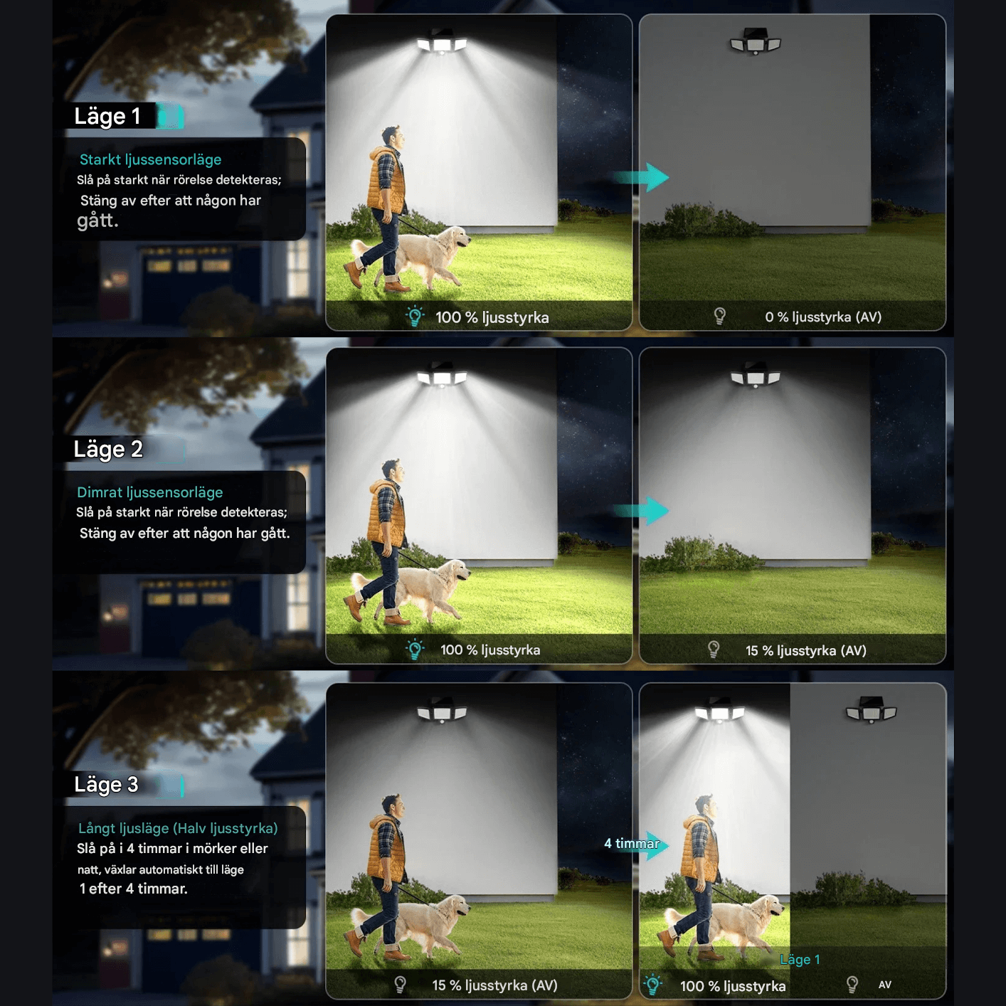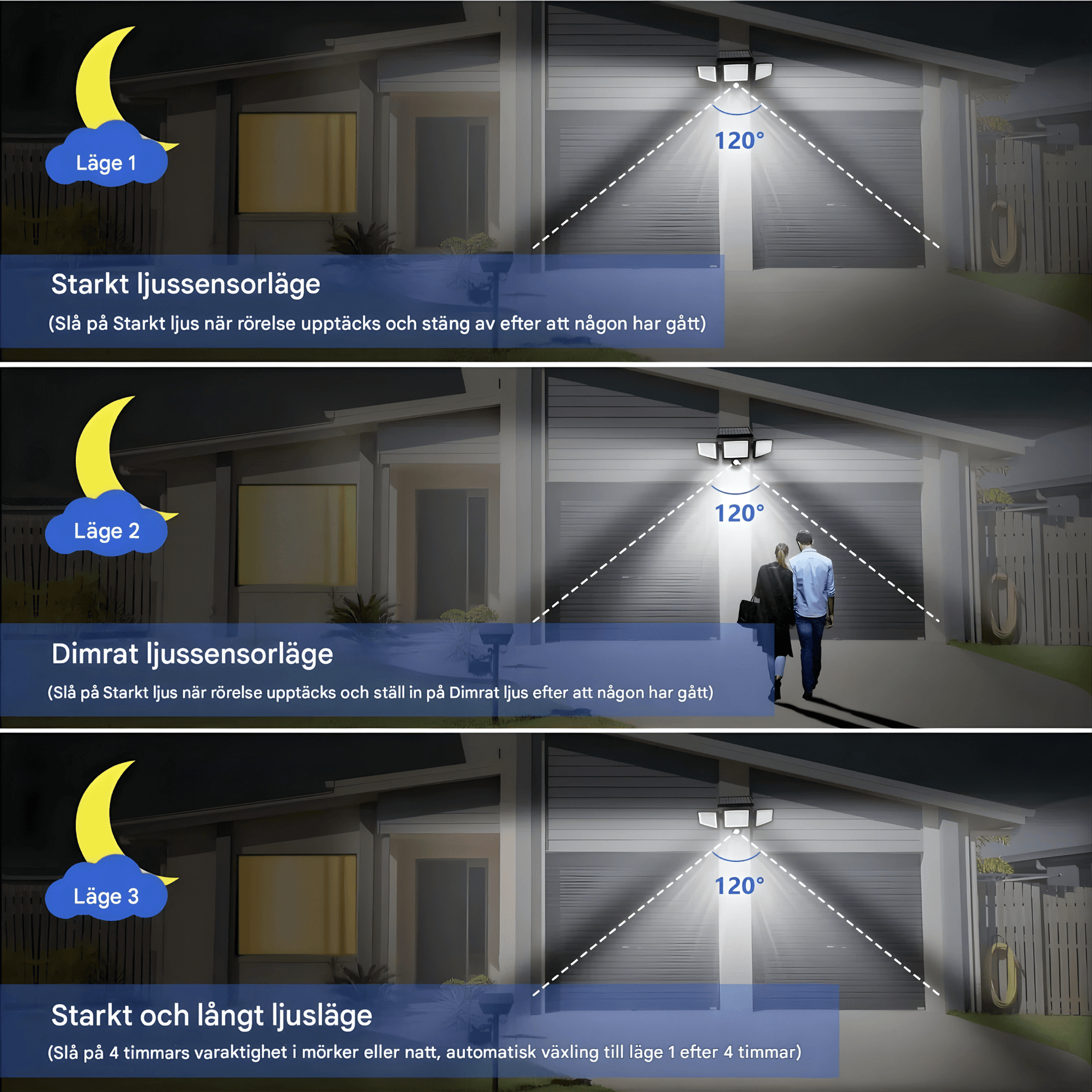 La lampe propose trois modes lumineux différents pouvant être adaptés à l’environnement. Vous pouvez choisir un éclairage puissant activé par mouvement, une lumière de base faible qui augmente lorsqu’un mouvement est détecté, ou un éclairage constant pendant quelques heures avant que l’appareil ne revienne automatiquement en mode capteur. Cela offre de la flexibilité que ce soit pour les entrées, les chemins ou le jardin.