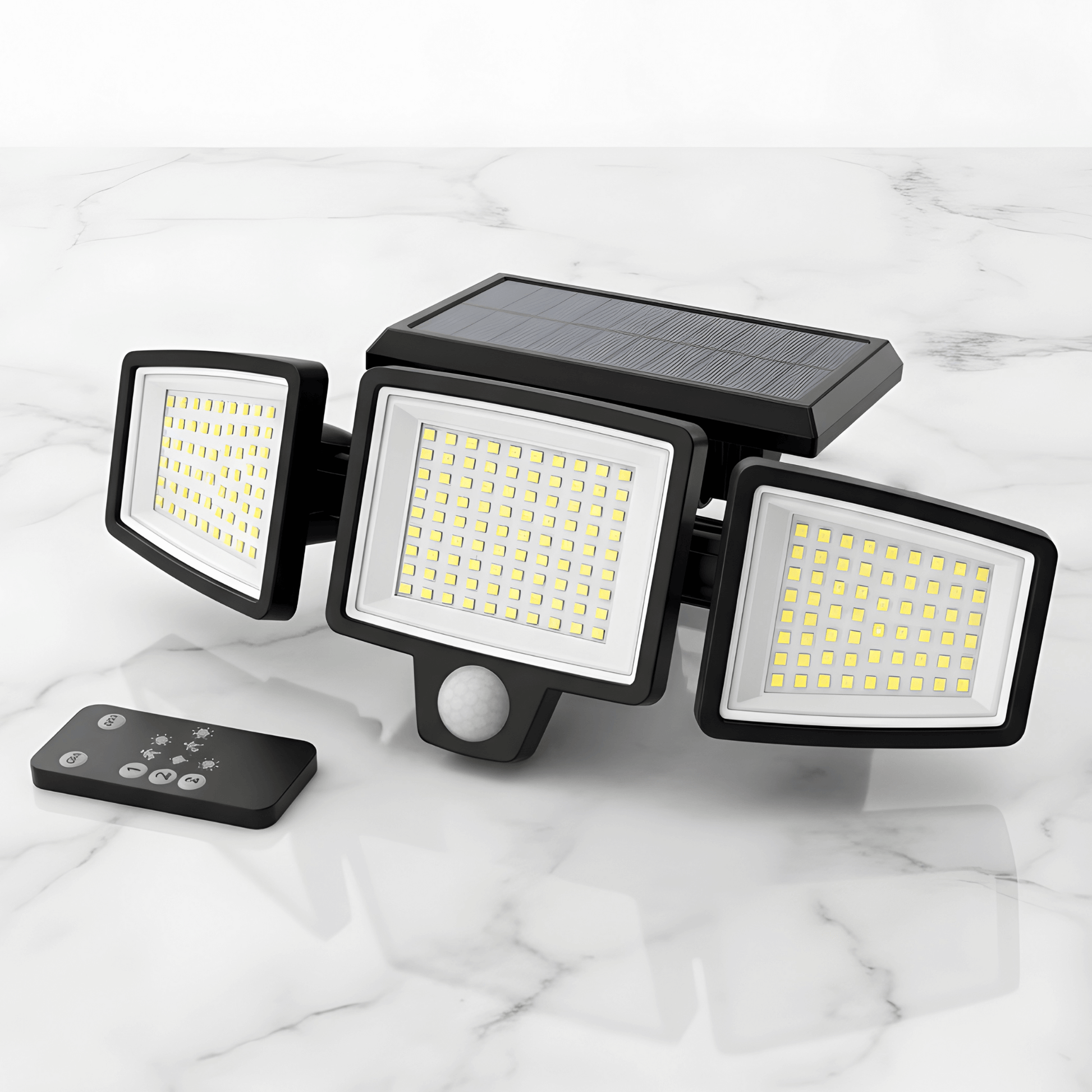 WESLEY – Éclairage extérieur à 3 têtes alimenté par énergie solaire avec détecteur de mouvement et télécommande pour jardins, façades et allées