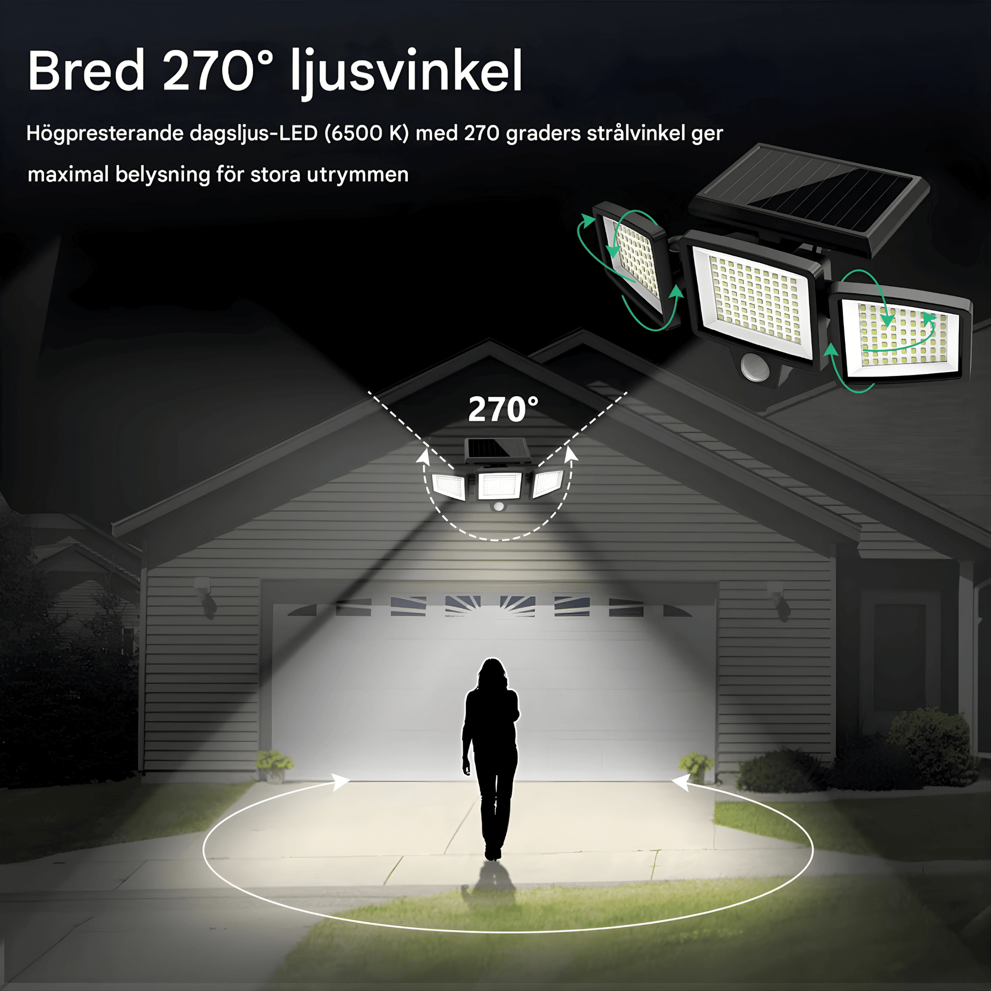 - 🔆 Large couverture lumineuse à 270° – trois têtes LED orientables pour un éclairage optimal