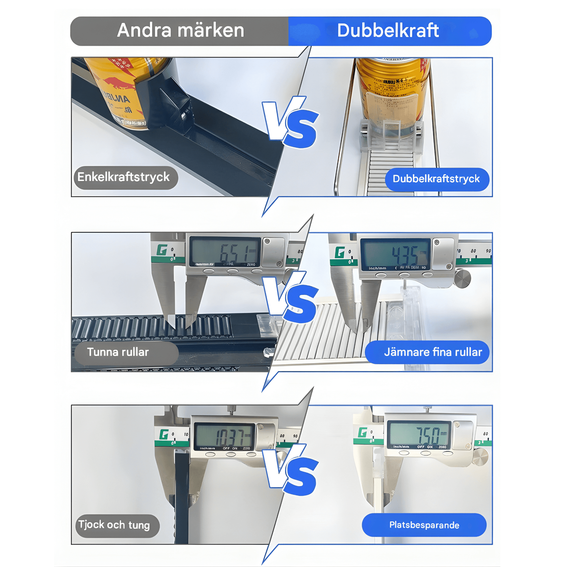Varje pusher kan justeras för att passa olika typer av drycker – från smala energidrycker till bredare PET-flaskor. Flera enheter kan kopplas samman för längre hyllor eller större kylar.