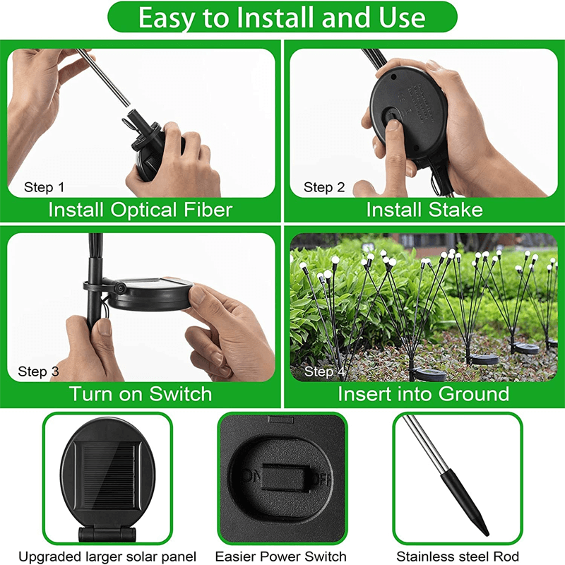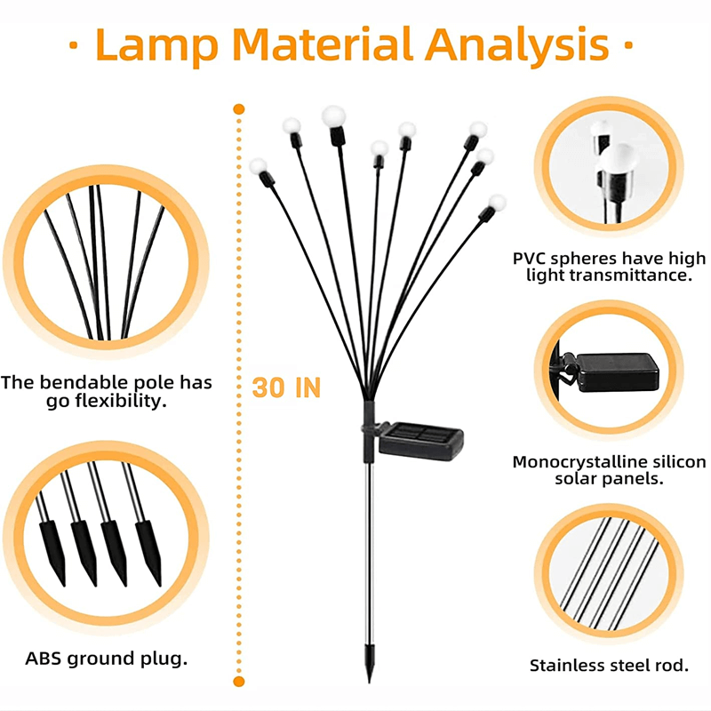 Dessa lampor simulerar de mjuka fladdrande rörelserna hos eldflugor och skapar en unik och charmig atmosfär i din utomhusmiljö. Den mjuka, varma glöden lägger till en magisk touch i trädgårdar, gångvägar eller vilket utomhusområde som helst och förbättrar den övergripande estetiken.