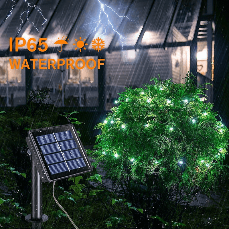 Designad för att klara utomhusförhållanden med sin vattentäta IP65-klassificering. Både ljusslingan och solpanelen är skyddade mot vatten, vilket gör att du kan använda dem i regnigt väder utan bekymmer.