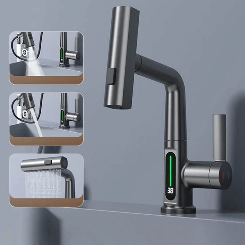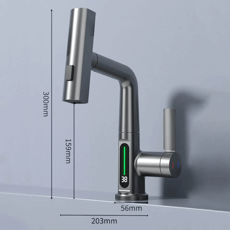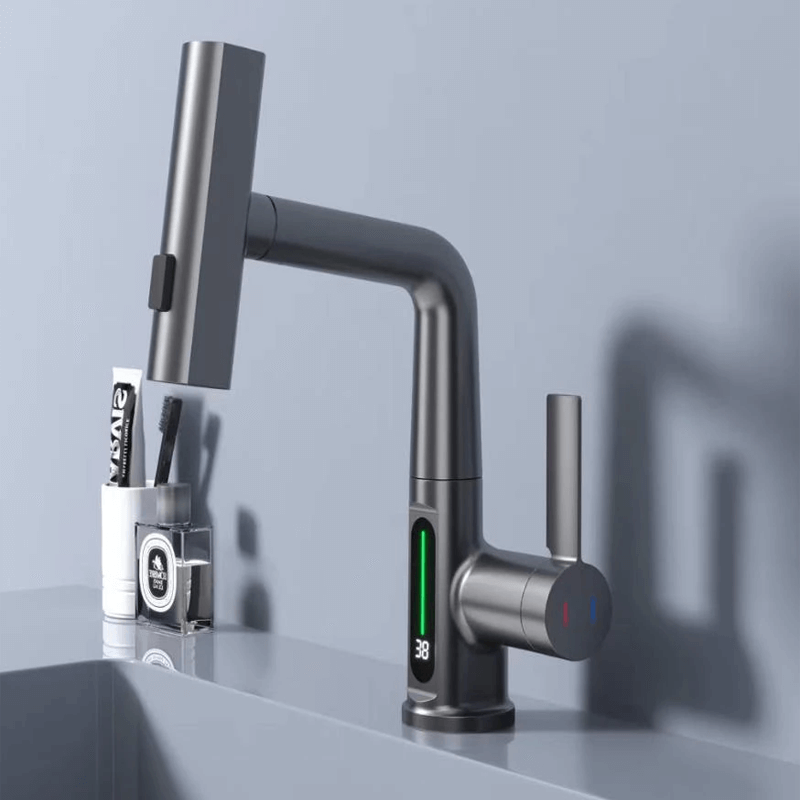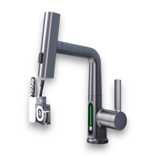 Vår innovativa temperaturdisplay säkerställer exakt kontroll, medan den flexibla utdragbara kranen och mångsidiga spraylägen gör köksuppgifter till en bris. Höj din köksutrymme och lägg till en touch av sofistikering med denna högkvalitativa lösning som lovar att förvandla din diskbänksupplevelse.