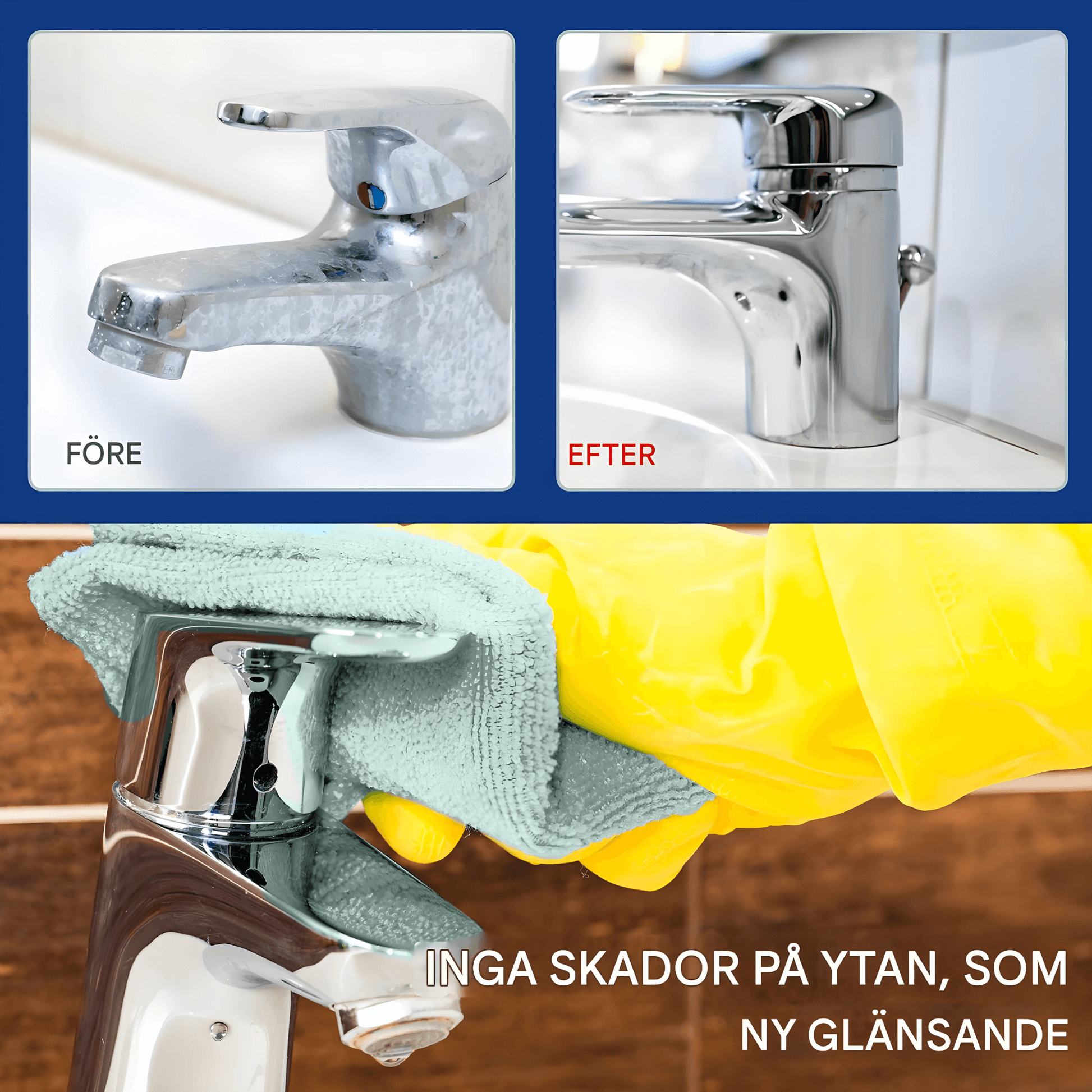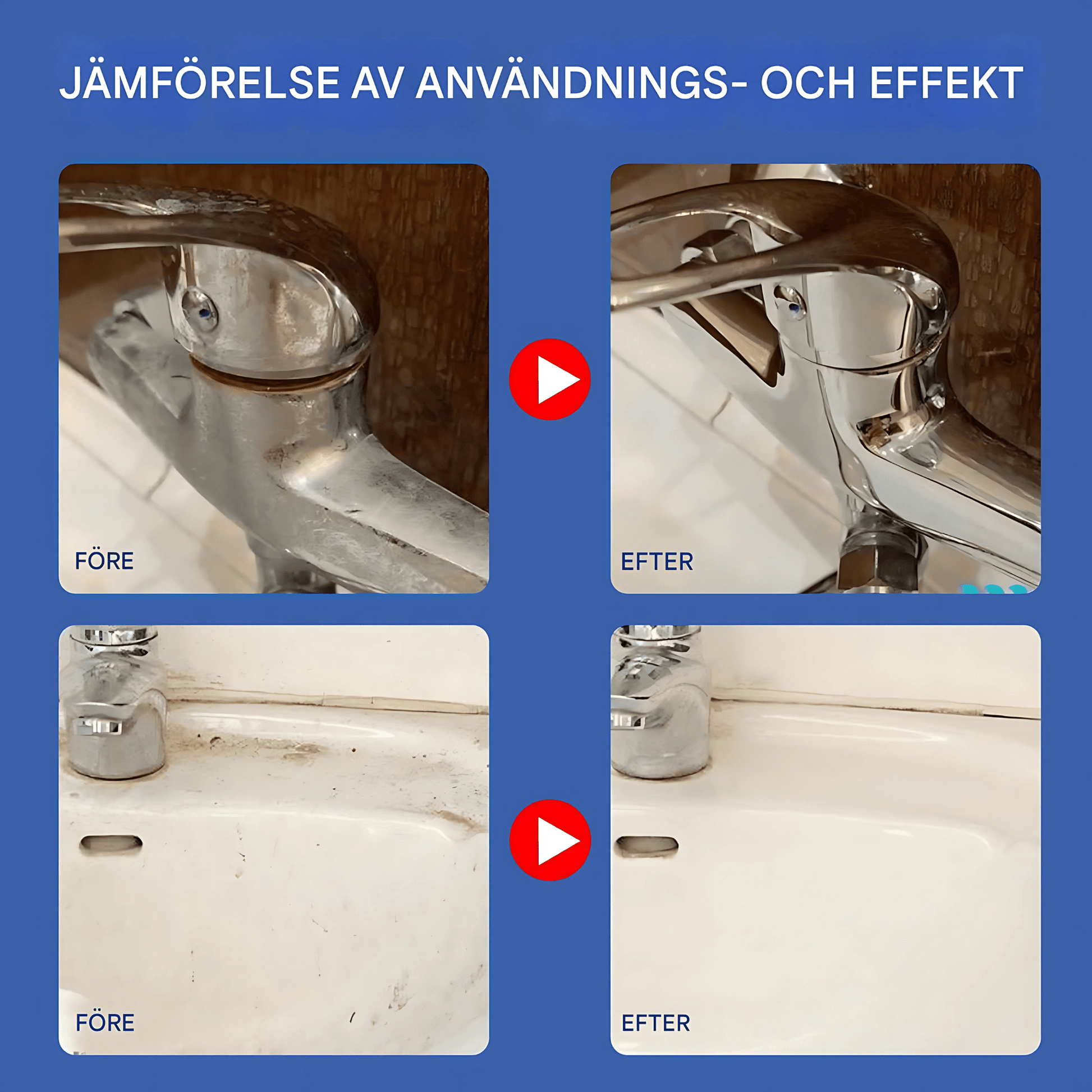Produkten kan potentiellt användas på glas, kakel, handfat, badkar, kranar och vissa metallytor.